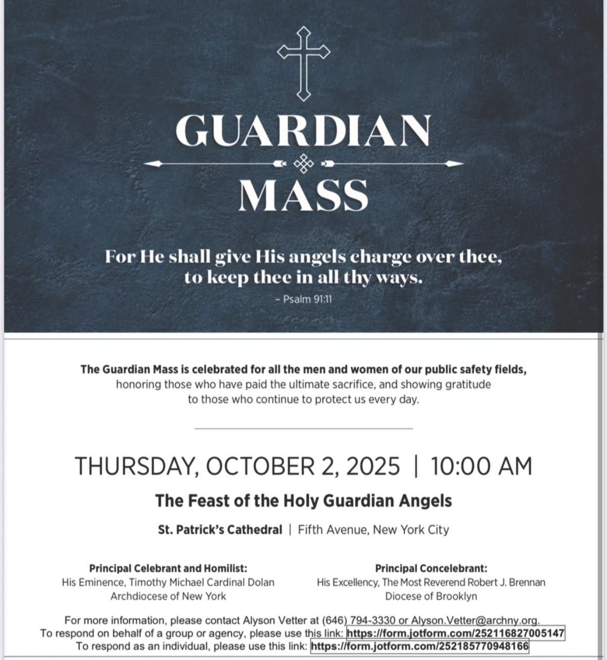 A Mass will be held in recognition of the Feast of the Holy Guardian Angels at 10:00am on Thursday, October 2, 2025 at St. Patrick's Cathedral located on 5th Avenue in Manhattan.